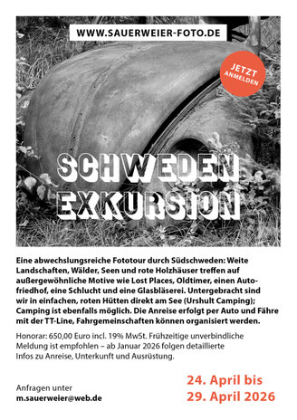 Eine fotografische Entdeckungstour durch Südschweden: Landschaft, Wald, Seen, rote Holzhäuser – dazu außergewöhnliche Motive wie Lost Places, Oldtimer, ein Autofriedhof, eine Schlucht, eine Glasbläserei und weitere spannende Exkursionspunkte. Wir reisen gemeinsam mit Autos und setzen mit der TT-Line ab Rostock oder Travemünde über. Unterkunft: Einfache, saubere rote Hütten direkt am See auf dem Campingplatz Urshult (alternativ Zelt / Wohnwagen / Wohnmobil). Abends klingt der Tag am Lagerfeuer aus.